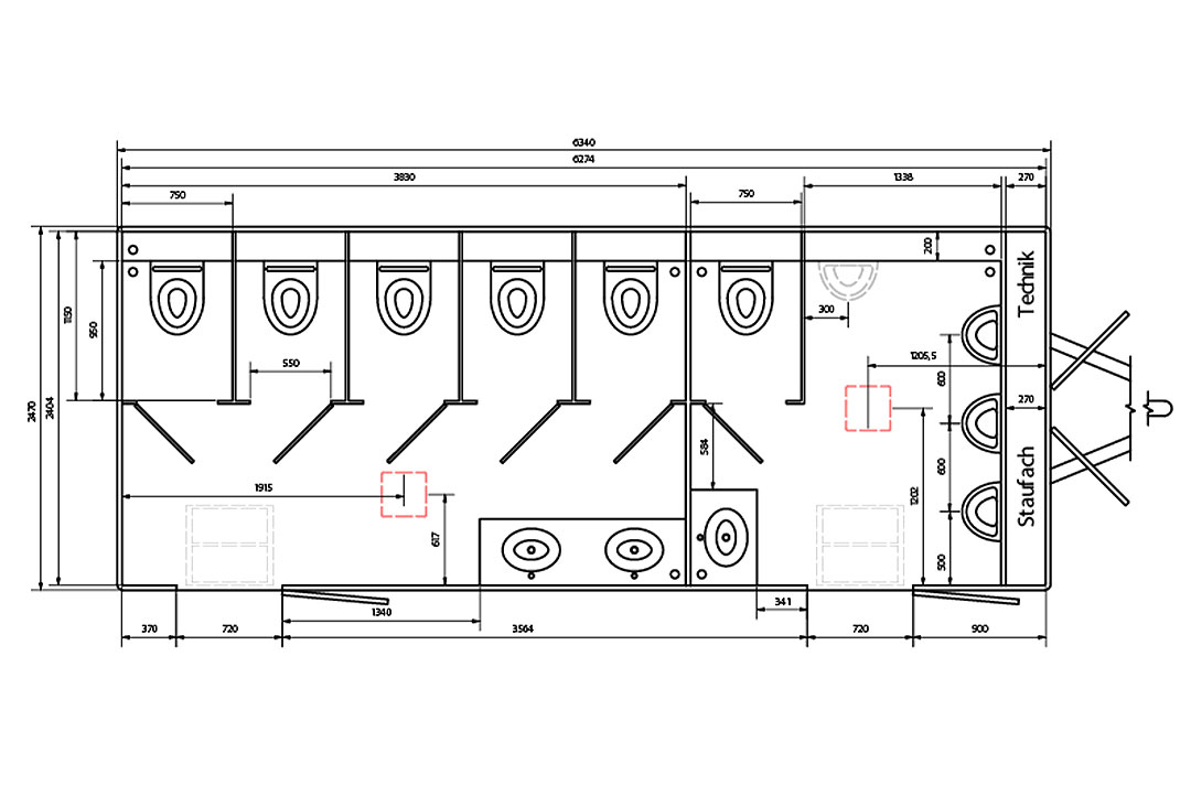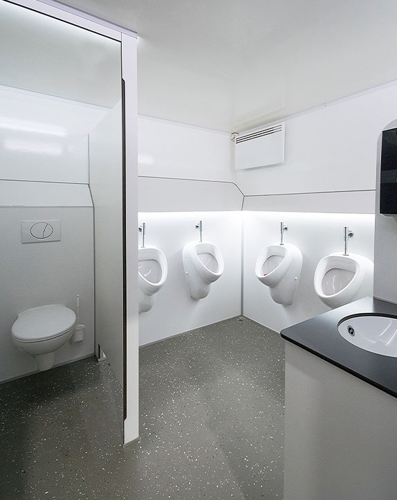 • 1 Herren-Toilette + 5 Urinale + 1 Handwaschbecken