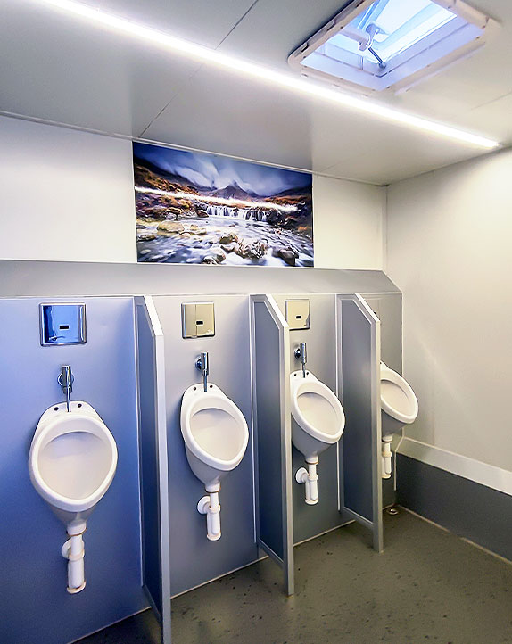 - Herren: 1 Toilette, 4 Urinale, 2 Waschbecken